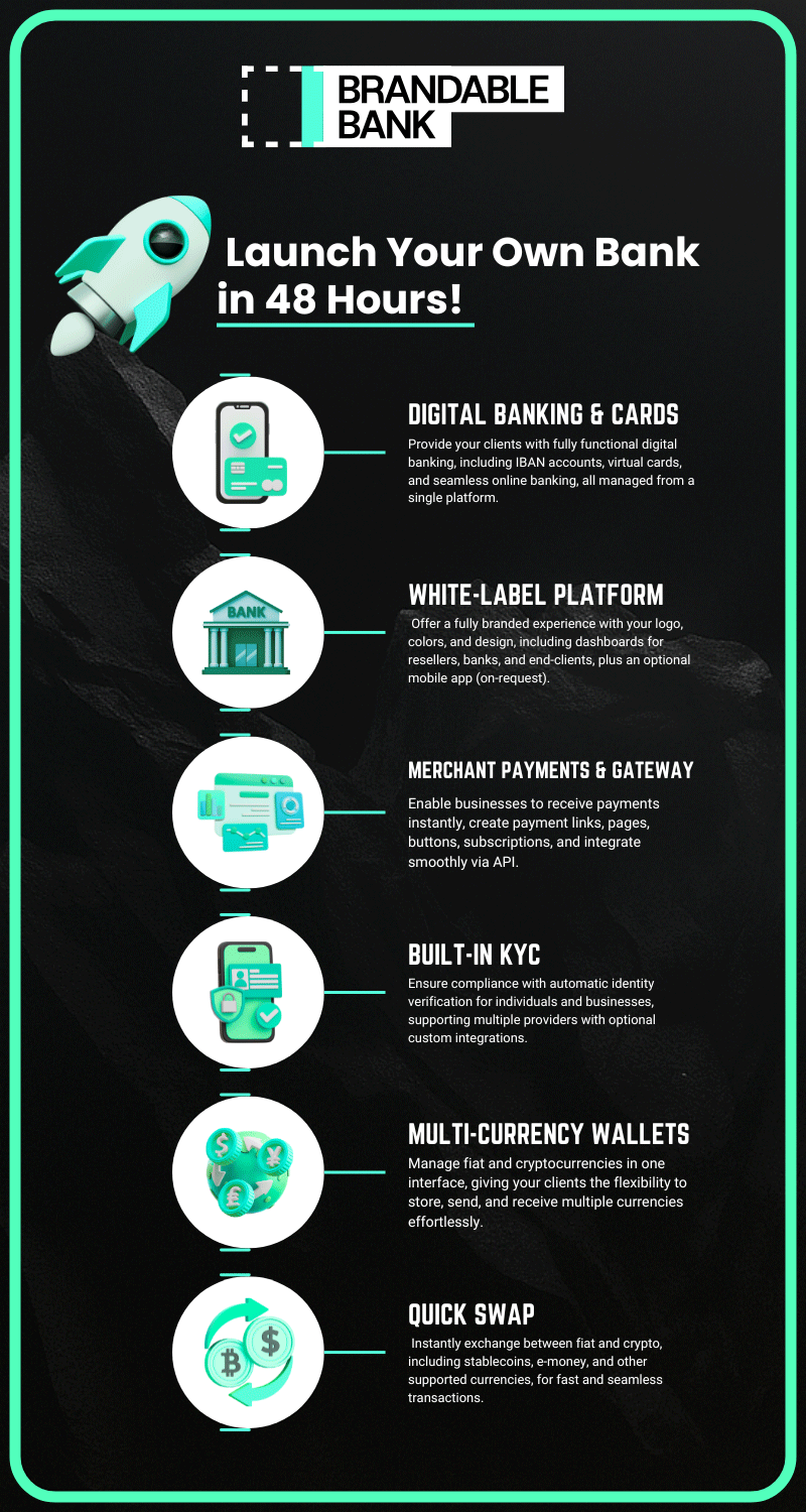 We offer the Ebanq® banking software platform sub-license and European Union (SEPA) payment clearing provider for inbound/outward transfers. For more information, download these PDF forms: